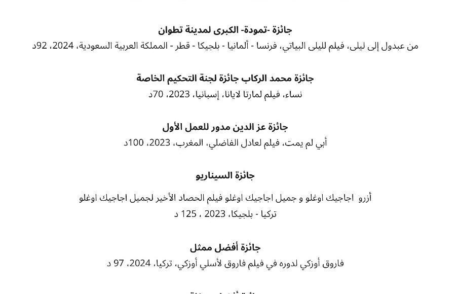 كما تم خلال الحفل الختامي الإعلان عن الأفلام الفائزة بجوائز هذه الدورة، حيث عادت الجائزة الكبرى تمودا لفيلم “من عبدول إلى ليلى”، للمخرجة ليلى البياتي.